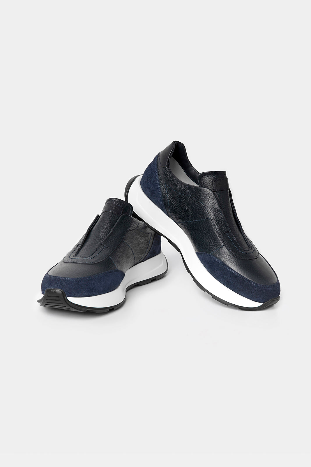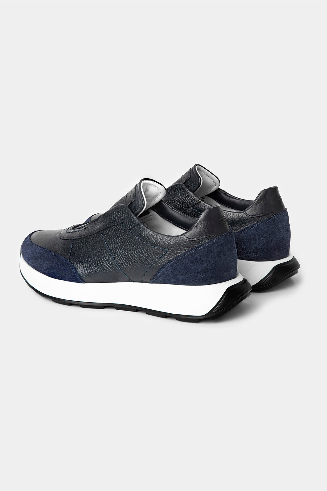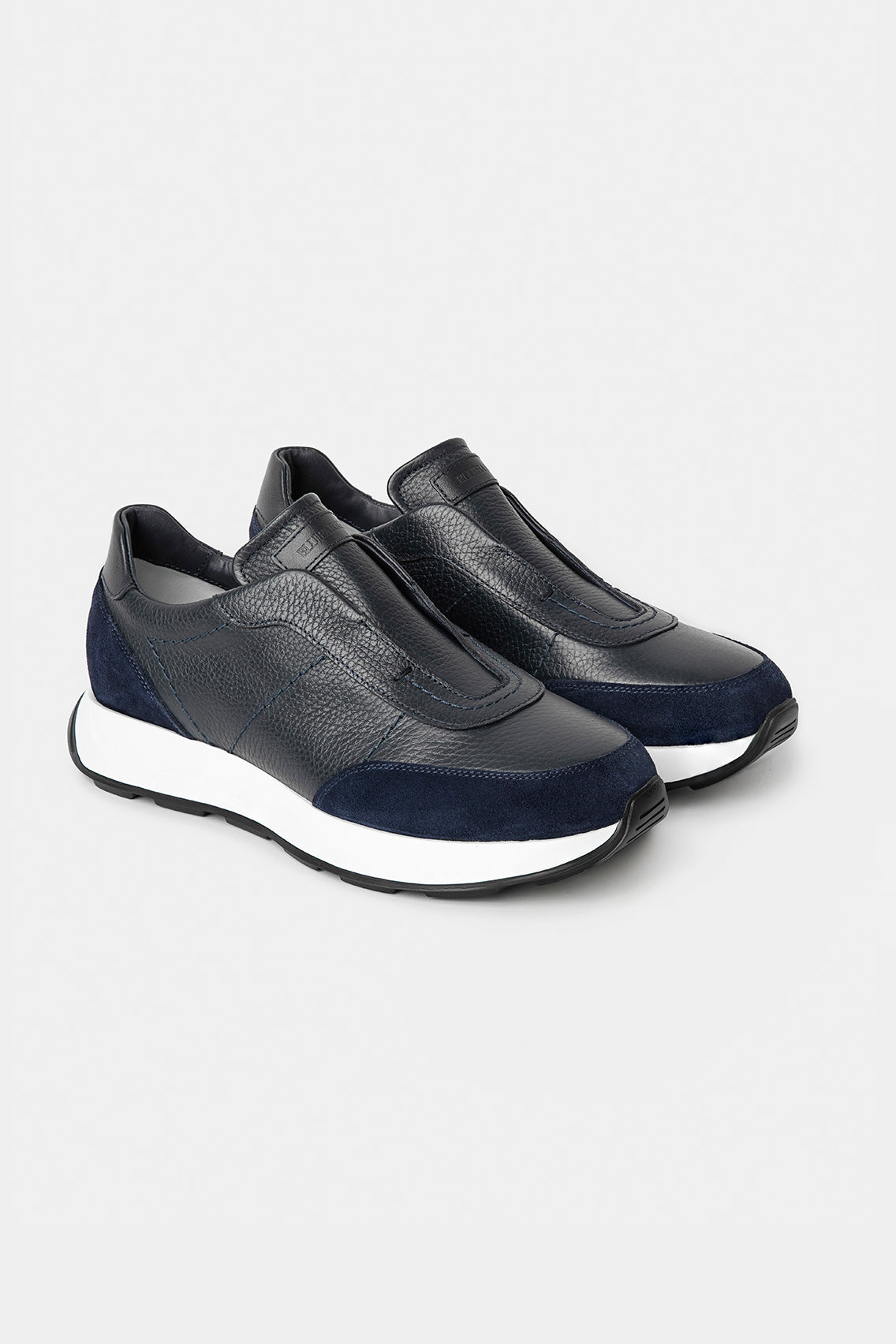 Crafted from grained leather and smooth navy suede, these slip-on sneakers offer a sleek, modern design with a sporty edge. The elasticated tongue ensures easy wear, while the lightweight rubber sole delivers all-day comfort and grip. A refined alternative to traditional laced trainers. Made in Italy.